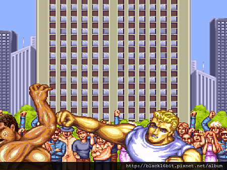 * MD 版以拳王過關會有張帥帥勝利姿勢的圖, SFC 版也把這圖片拿掉了...,實在不解,只能說 SFC 版要省卡匣容量吧。